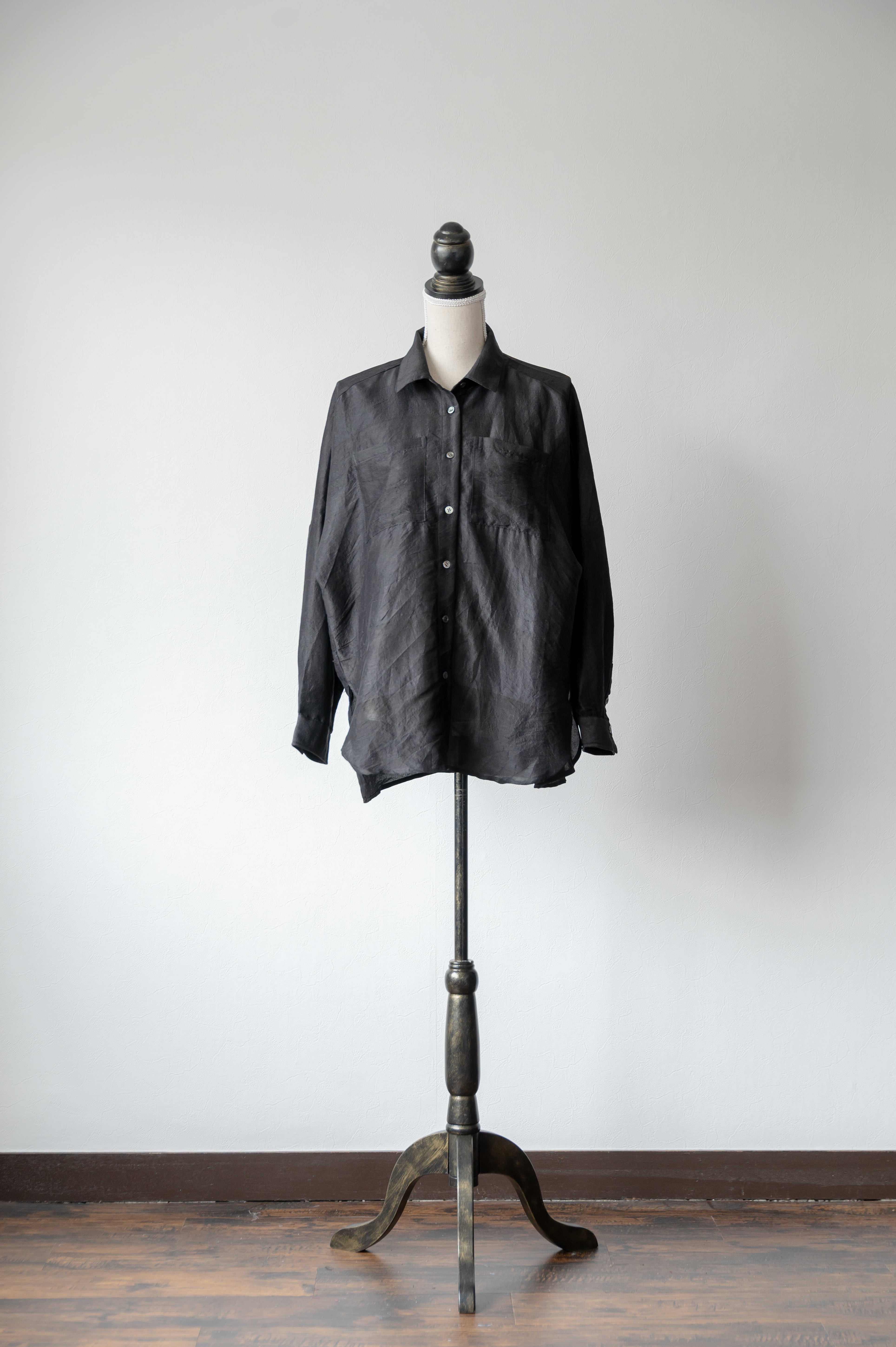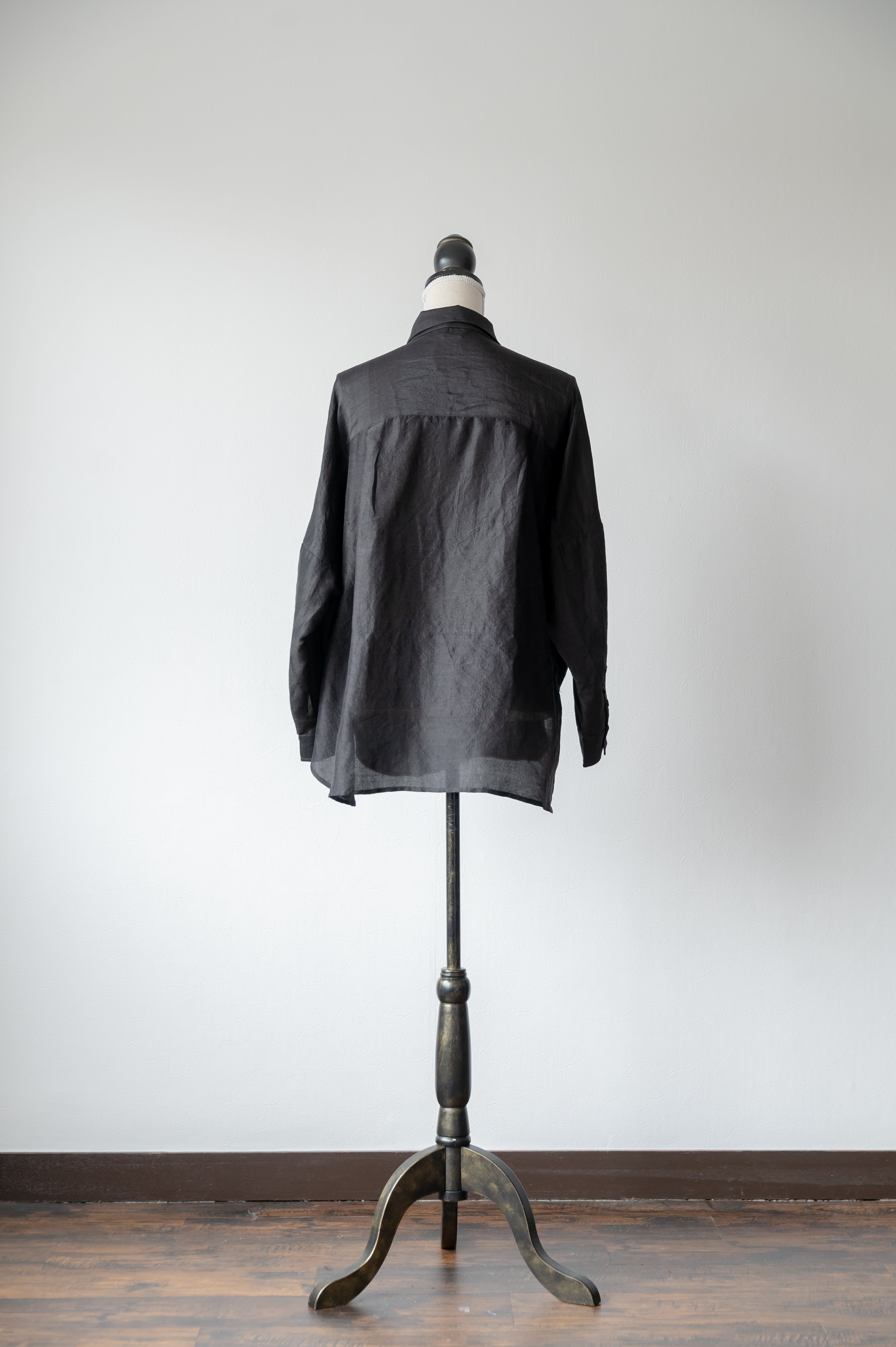 たっぷりとした身幅ですが、ドルマンスリーブと長すぎない着丈など、どんな体型の方でもこなれ感が出る絶妙なサイズ感です。シャツとしてはもちろん、羽織ものとしてもちょうど良く、薄手なので夏場でもお召しいただけます。